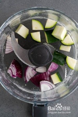 洋葱去皮,和西葫芦一起切成大块,放进料理机中,打5秒直至蔬菜被打碎。打之前: