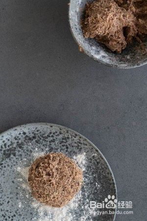 将打好的混合物移到碗里,加入面粉和燕麦碎片搅拌均匀后,用手把混合物捏成汉堡状。