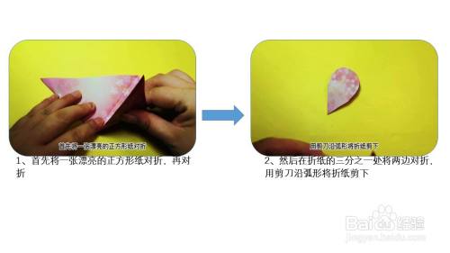 首先将一张漂亮的正方形纸对折,再对折,然后在折纸的三分之一处将两边对折,用剪刀沿弧形将折纸剪下。