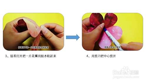 接着打开把一片花瓣用胶水粘起来,用剪刀把中心剪开。