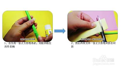 首先将一张正方形纸卷起。用胶水粘住用作花柄,然后再拿另外一张正方形纸对折再对折。