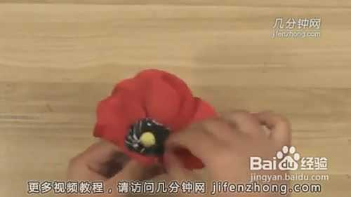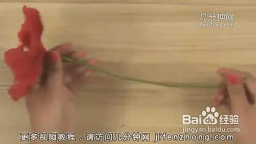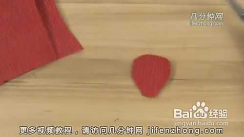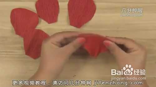 从红色皱纸中剪取5张花瓣的形状,用指尖拉伸花瓣外缘进行装饰。