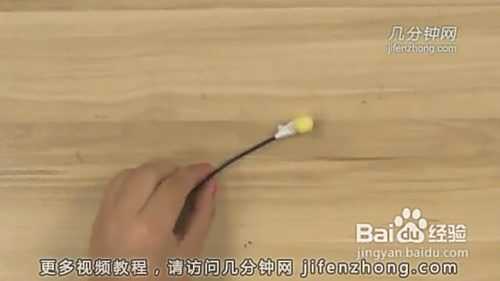 剪取一段园艺金属丝制作茎杆。将金属丝顶端弯曲成环,环中塞入一小块棉絮。棉絮用圆形的黄色皱纸裹住,周围用胶带固定。