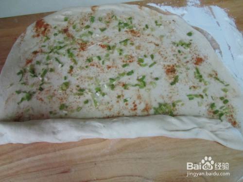 分别撒上盐、 辣椒粉和小葱末