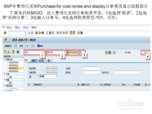 事务代码MIGO,进入费用化采购订单收货界面,1处选择“收货”,2处选择“采购订单”,3处输入订单号,4处选择收货类型-101,回车;