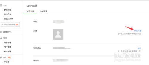登录微信公众号,进入【公众号设置】页面。找到【头像】那一栏,点后面的【修改】。