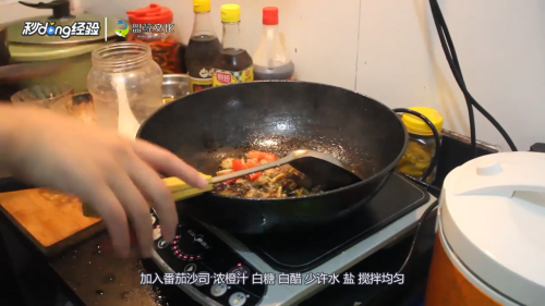 8加入番茄沙司,浓橙汁,白糖,白醋,少许水,盐搅拌均匀。