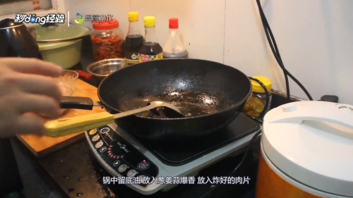 7锅中留底油,放入葱姜蒜爆香放入炸好的肉片。