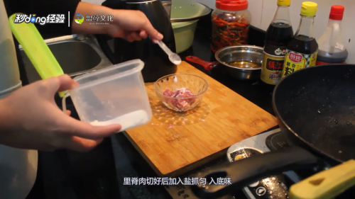 3里脊肉切好,加入盐抓匀入底味,加入湿淀粉少量的水充分的抓匀。