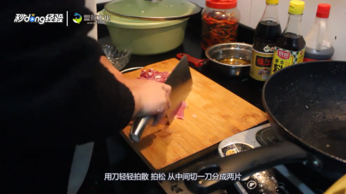 2用刀轻轻拍散拍松从中间切一刀分成两片。