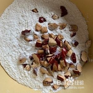 红枣切小粒,跟面粉混合。