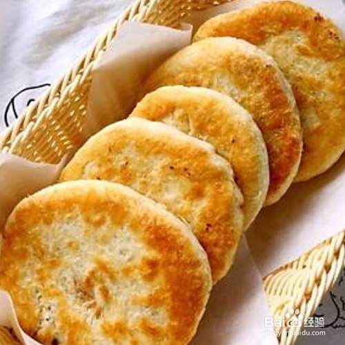 电饼铛加热放入花生油,油热加入醒发好的生胚,盖盖煎制,一面好了再加油煎另一面,煎至两面金黄,还能闻到肉香味。煎好的火烧出锅啦,很烫哦。