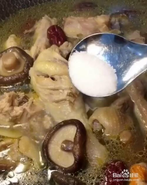 再炖12分左右放盐调味, 营养香菇红枣土鸡汤就做好了