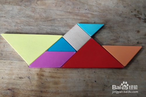 摆上黄色三角形,放在左侧挨着,如图。这样就拼组好了。