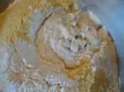 在面粉里放入三分之一的玉米面,再放入发酵面。