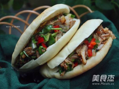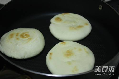 19烙好的白馍用刀从中间割开,塞入调好的肉馅。完成。