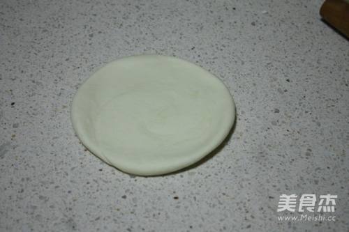 15把面卷压平,用擀面棍擀开成手掌般大小的面饼。