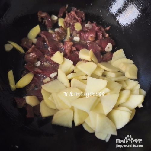 在牛肉的锅里放入土豆片继续翻炒1分钟左右。