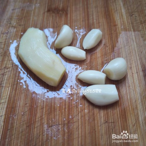 准备1块生姜和6个蒜瓣,去皮洗干净,切片备用。