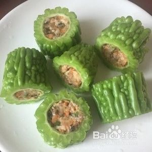 用筷子将馅料塞到苦瓜肚子里,记得塞紧实哟,不然可能会散掉呢