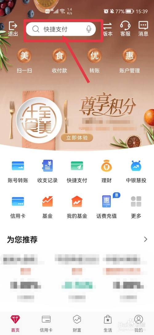 打开需要取消的手机银行并搜索快捷支付进入