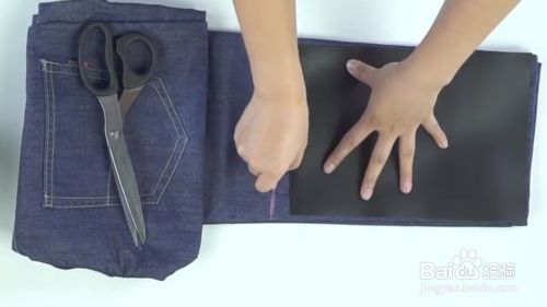 将卡纸平铺在已经折叠平整放好的裤腿上,用笔在牛仔裤与卡纸对齐处划线。