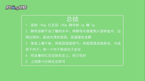 2准备配料:酵母溶解于加了糖的水中,将酵母水缓缓倒入面粉盆中,边倒边搅拌,揉成光滑的面团,放温暖处发酵,案板上撒干粉,将面团揉圆排气,将面团揉成细条状,分成若干剂子,将一个剂子擀成饺子皮状,挖适量的红豆馅放在皮上,依次包好。