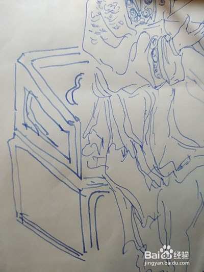 她坐的非常端正,接下来画他坐下的一张椅子,这是一个低背的中色座椅,很宽大很舒适,非常富有中国特色,从样式上看应该是明代的坐椅,
