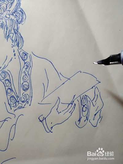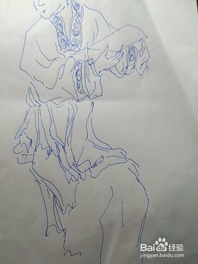 5,在他的服装上还有很精美的绣花,我们用弧线条用图案的方法画出图案表示,