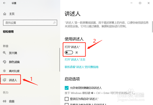 进入界面后,先点击左边的“讲述人”选项,再看到右边使用讲述人,打开按钮即可。