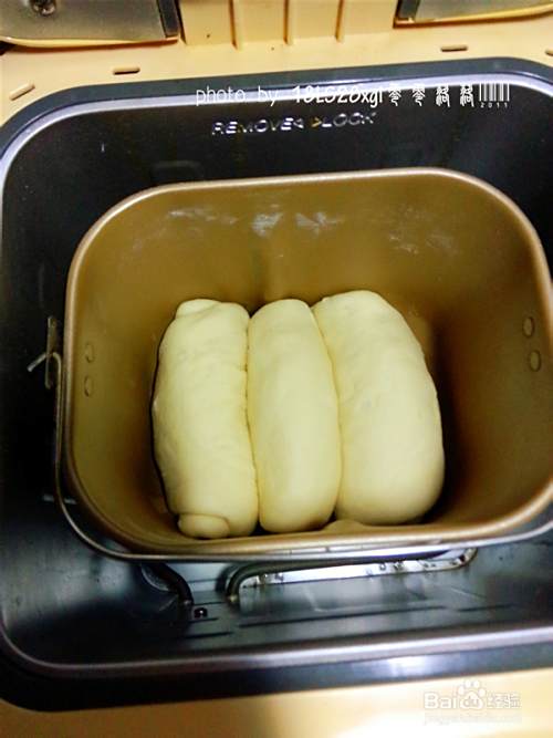 3个面团都卷好,然后放在面包机里,盖上湿布,进行二次发酵;
