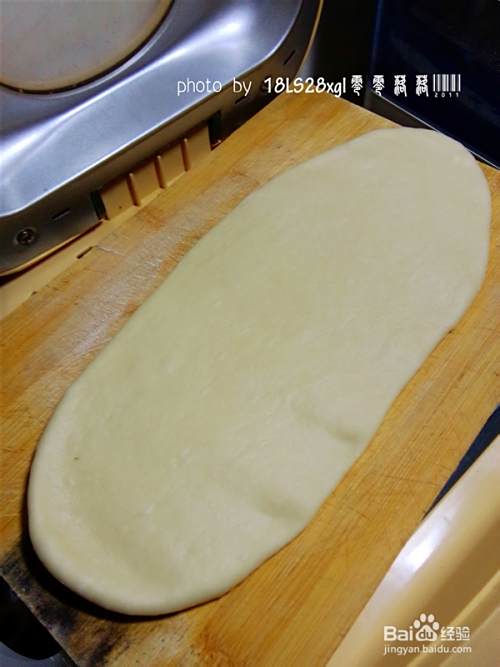 面团分成3分,在案板上撒一些干面粉,取一个面团,用擀面杖擀成长长的片;