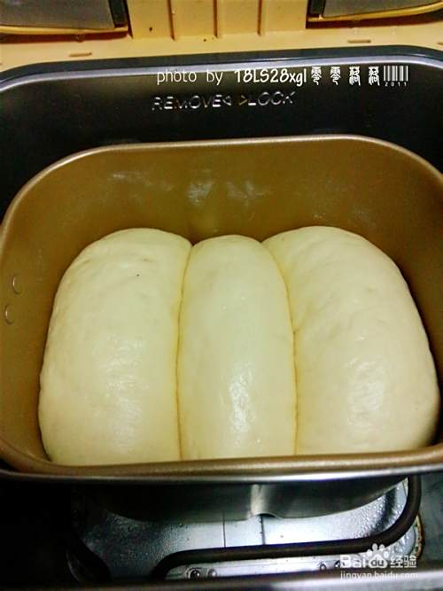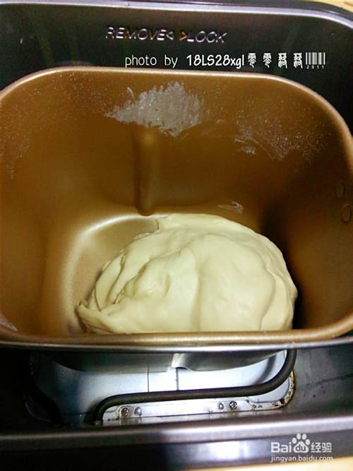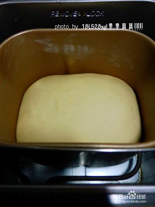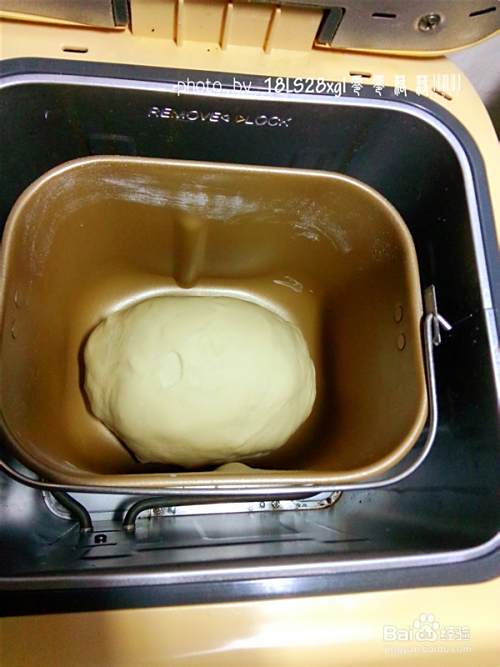 将面包桶里的搅拌刀取掉,面团团好,放在面包桶里发酵;