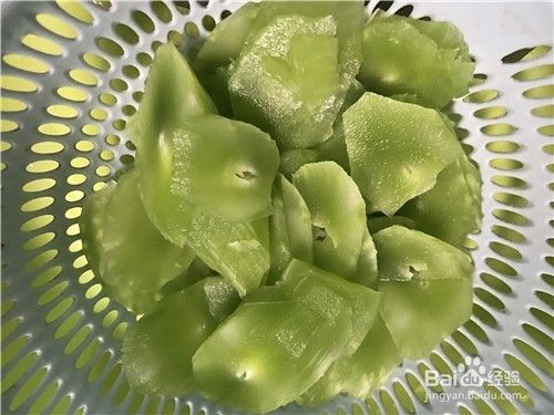 莴笋去皮切成片状。将莴笋去皮以后,清洗干净,然后再用刀将其切成片状,如图所示,尽量薄一些,这样才能让莴笋更容易入味,也能更容易变熟来,这样是非常好的。