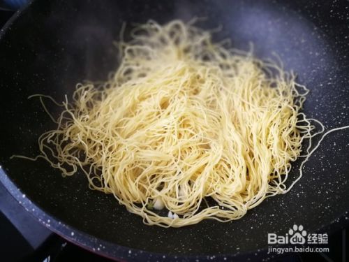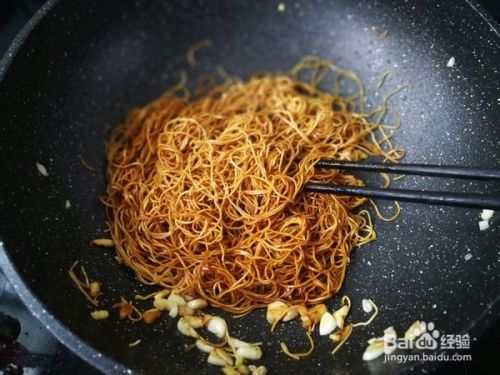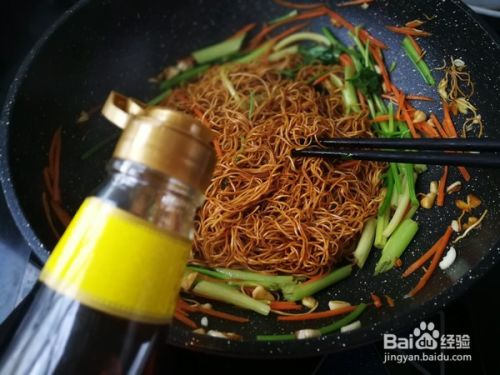 把面条两面都要煎1分钟左右,再用筷子挑散,然后加入酱油与鲍鱼汁