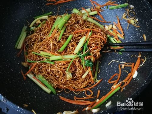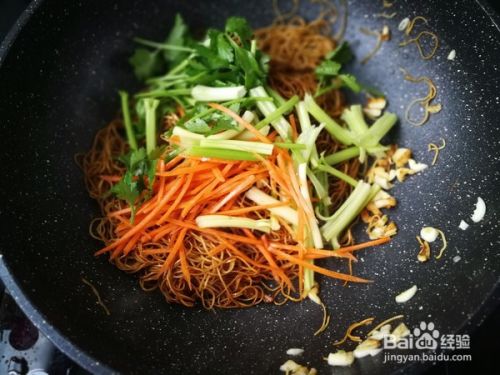 面条用筷子挑着炒,因为用的是不粘锅,面条是不会糊锅的,要是觉得太干可以喷点水,全部炒至入味,加入胡萝卜、芹菜、香菜