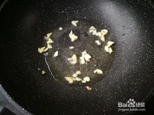 烧热不粘锅,下花生油在锅里,再放蒜末爆出香味