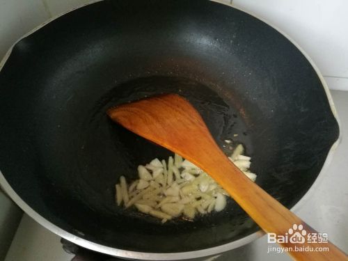 锅烧至七成热,加入适量油烧热,放入姜丝、蒜头炒出香味。
