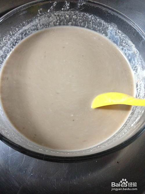 粉浆搅拌下放入一勺,勺子大小没所谓,只要每次都一样量就好,记得每次搅拌下再倒粉浆