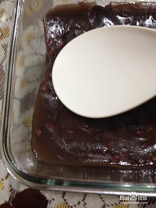 将红豆水加入粉和糖中,搅拌均匀,不含粉粒。继续在热水中搅拌。用手试试。有点热,不太粘