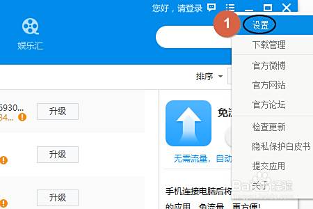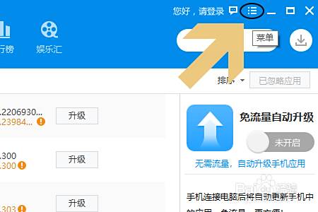 不过以上的方法只是暂时的,如果想要永久取消升级提醒,那就要返回到手机助手主页面,然后点击右上角的“菜单”图标,如下图所示...