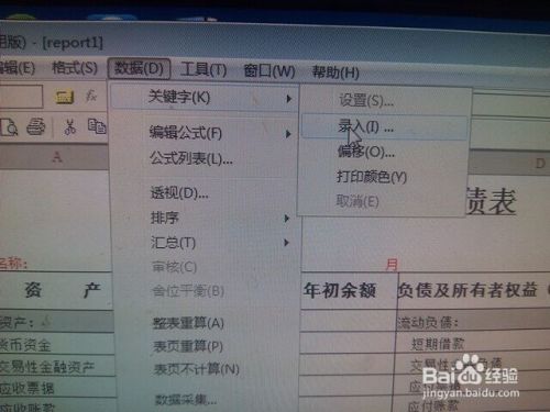 然后在数据的格式状态下,上面数据——关键字——录入。这里面可以录入帐套的名字,以及要取得数据的年月。完了以后点击确定就可以了。