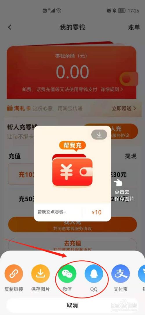 然后选择通过微信/QQ等方式,发送零钱代充吱口令给好友。