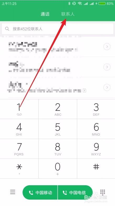 在打开的小米手机拨号界面,我们点击上面的“联系人”菜单项。