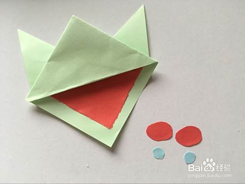 剪一张红色较小的正方形,用点胶,如图贴上,变成一个红色的嘴巴