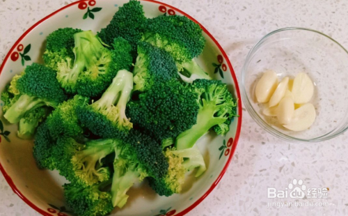 准备新鲜的西兰花一个,清洗干净,去掉坏叶,蒜子剥皮备用