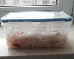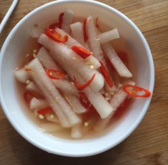 然后把盐水到处去、接下来放入糖、醋、小红辣椒!均匀混合