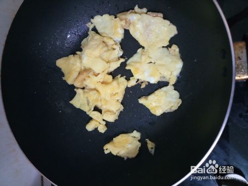 鸡蛋打散以后,加入清水。锅热后,倒油大火加热,倒入鸡蛋,用铲子在锅中将鸡蛋搅成小块,盛出备用。