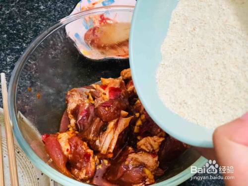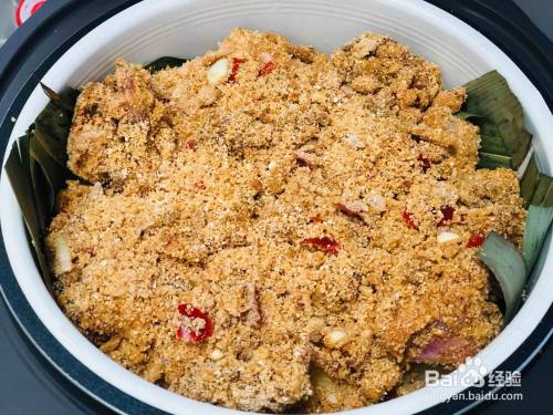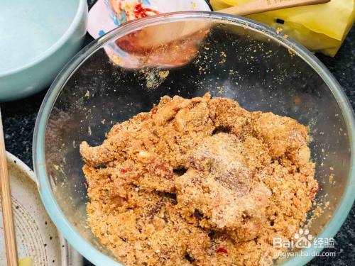 6,加入自制米粉,让米粉均匀包裹在排骨上