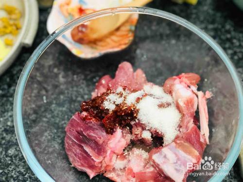 2,往排骨里面加入各种调料品,豆瓣酱,白糖,椒盐,黑胡椒粉,鸡精,食盐